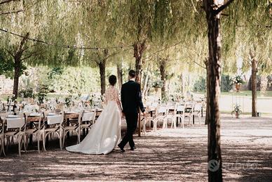 Condizioni: usato. L’abito è stato lavato professionalmente. Presenta solo lievi aloni nella parte inferiore della gonna, dovuti al contatto con il terreno durante la giornata: si tratta di un dettaglio facilmente eliminabile con un semplice accorciamento dell’orlo.