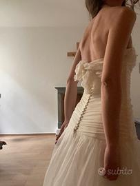 Abito su misura, bianco avorio. Il corpino, con bottoni sul retro, fascia fino ai fianchi mentre la gonna veste morbidamente con diversi strati di tulle, raso e chiffon. La manica a tre quarti copre fino alle spalle e rende l’abito ideale per la mezza stagione. Il corpino è su misura per persone dal seno piccolo (seconda, coppa B). Il rivestimento in chiffon della parte superiore richiede sostituzione e l’orlo inferiore è stato danneggiato in un punto, come si puó vedere dalle foto. Vendo a meno di 1/3 del prezzo di mercato. Informazioni aggiuntive: sono alta 163 cm e per il matrimonio indossavo tacco 11. La mia taglia abituale in vita è la 42/M, ma il capo è lievemente elasticizzato. Una meraviglia da indossare!