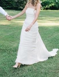 Vendo raffinato abito da sposa Le Spose di Gio. Doppio strato di seta. Taglia 40. Sono alta 1,70. Coprispalle ad anello e guanti inclusi. Lavato in tintoria.