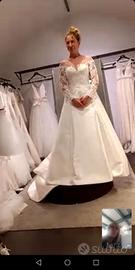 Abito da sposa in raso con corpetto tutto pizzo e manica lunga omerale con pizzo effetto tattoo, scollo a cuore. Schiena coperta.Velo non compreso comprato in atelier "Come in una favola"Mai indossato solo provato. taglia 42, no velo.