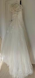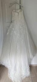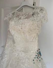 Vendo abito da sposa marca pronovias, taglia 42, scollo a cuore, pizzo, con inserto laterale in svarowsky azzurri rimovibili e lieve strascico, abito molto comodo, leggero, in ottime condizioni e lavato in lavanderia subito dopo il matrimonio. Insieme al vestito c’è anche la maglina sempre in pizzo con chiusura posteriore e semi velo (vedi foto) non spedisco, ritiro in loco, se volete le foto del vestito indossato chiedetemelo in privato. Prezzo leggermente trattabile (da valutare).