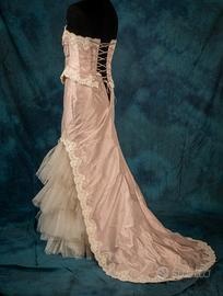 Splendido abito da sposa di seta color rosa antico (corpetto con coppe + gonna con piccolo strascico), interamente foderato, completo di velo. Taglia 44, veste 42. Sono alta m 1,60 e l'ho indossato con 7 cm di tacco. Pulito in lavanderia.