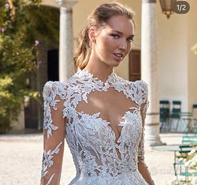 Abito stile principessa tg42 della maison made in italy VELA. Pizzi completamente cuciti a mano. Velo cattedrale con pizzo in cornice incluso