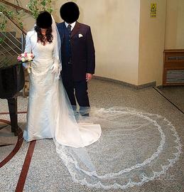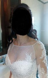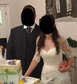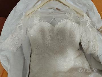 AFFITTO abito da sposa meraviglioso in perfette condizioni della Pronovias Barcelona acquistato al Centro Pompilio. Abito conservato scrupolosamente nella sacca originaria per conservare i tessuti e la lunghezza. Colore bianco perlato con ricamo velato sul petto e sulle maniche a tre quarti. Velo lunghissimo e chiusura nel dietro con tanti bottoncini perlati. Taglia 42.