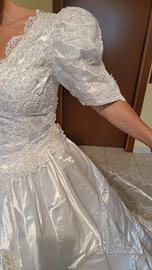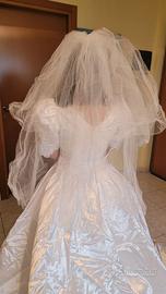 Abito da sposa taglia 44, in raso bianco impreziosito da pizzo e perle. Sottogonna in tulle, corpetto preziosissimo con scollo a cuore ematica a sbuffo fino al gomito. Lungo strascico. Velo corto con pettinino. Verrà spedito sottovuoto.