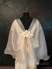 In preziosa tripla organza di pura seta con maniche a palloncino e corpino posteriore in pizzo .Sulla scollatura posteriore un’orchidea che ferma un soffice strascico di organza ,staccabile,che puó essere indossato in più modi.