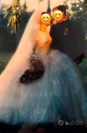 Splendido abito da sposa tutto in pizzo e merletto. Decorato con perle e pizzo. Maniche in pizzo a sbuffo. Chiusura posteriore con perle. 16 metri di tulle sotto la gonna. Compreso di velo. Taglia 44. Colore avorio.