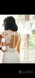 Abito da sposa elegante e raffinato. Collezione 2024. Acquistato a 2400€. Indossato una volta sola, condizioni perfette e lavato in lavanderia professionale. Corpetto in pizzo lavorato molto elegante. Linea fluida che slancia la figura. Coda con dettagli in pizzo. Taglia S. Disponibile per prova in zona Modena. Prezzo trattabile.