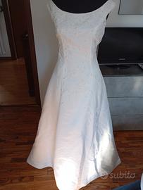Abito da sposa bianco taglia 42 con coda e velo lungo fatto su misura in fabbrica, con ricamo in perline sul busto e sulla coda. L' abito è stato usato una volta, lavato in lavanderia e custodito nel suo foderino.