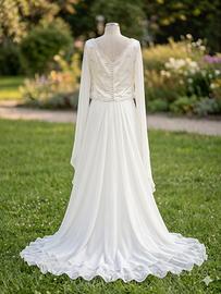 vestito da sposa, due pezzi. sartoriale. maniche a calla, scollo barca davanti e a V sul retro. Gonna stile romano con sottogonna se si vuole un effetto più pomposo. fatto su misura per una 50 ma essendo sartoriale si può sistemare.