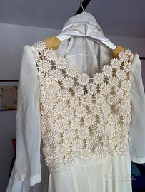 fiori sul busto, cerniera sul retro, manica a tre/quarti incluso di velo, guanti