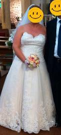 Abito da sposa Mori Lee taglia 46, realizzato in atelier, ottime condizioni, colore champagne, con ricamo e perline su corpetto, strascico. Compreso di velo.