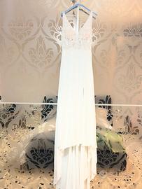Modello elegante e moderno: corpino con pizzo ricamato e trasparenze scollo a V, imbottitura interna per dare tocco di push up gonna fluida con spacco frontale e lunga coda.