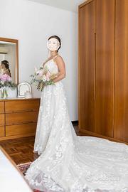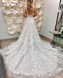 Abito dallo stile romantico boho chic, in tulle color avorio con raffinati ricami floreali 3D che scendono armoniosamente dal corpetto fino alla gonna e allo strascico.