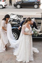 La gonna è morbida, leggera e fluida, con uno strascico importante ma facile e leggera da gestire.
