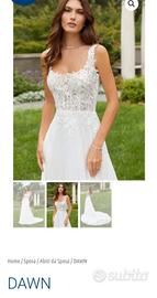 Vendo splendido abito da sposa taglia 42 (sposa alta 172 e peso 58 kg. Indossavo scarpe basse, non tacchi), acquistato in atelier di Milano a dicembre 2023. Lo strascico della gonna ha una piccola asola che consente di attaccarlo con un bottoncino al fondo della schiena, in modo da non essere di ingombro durante la giornata. In questo modo sembrerà di avere due abiti...uno con strascico, uno solo lungo fino ai piedi. Consegna a mano VCO e dintorni o spedizione.