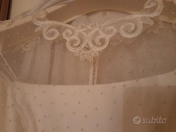 Abito da sposa, taglia 42- 44, elegante, dalle linee morbide, ottima vestibilità, con corpetto e maniche lavorate, dall'effetto sobrio e raffinato, con strascico lungo con decorazione posteriore. Velo lungo con applicazione al bordo e perline bianche, completo di guanti e decorazione per acconciatura. Da sottolineare che l' abito può essere trasformato, sartorialmente, in abito da cerimonia, riutilizzando il corpetto lavorato e la gonna sottostante, a seconda delle esigenze e della creatività di chi lo reinventa. L'abito è praticamente regalato, in quanto il prezzo è simbolico.