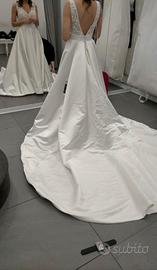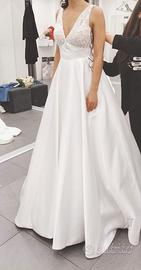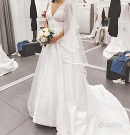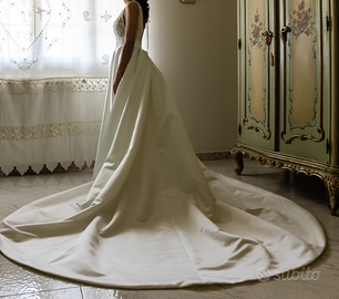 Abito da sposa elegante e raffinato, indossato una sola volta e in condizioni pari al nuovo. Il modello presenta una romantica silhouette a principessa, perfetta per valorizzare la figura e creare un effetto scenografico. La scollatura a V sul davanti esalta il décolleté con delicatezza, mentre la schiena con scollo a V aggiunge un tocco di eleganza e femminilità. Realizzato in tessuto duchesse, l’abito si distingue per la sua struttura importante e luminosa, che dona volume e un aspetto raffinato. Il design senza maniche mette in risalto le spalle, rendendolo ideale per un look sofisticato e senza tempo. Il punto vita è definito da una cintura che valorizza la silhouette e completa armoniosamente il modello. Perfetto per spose che desiderano un abito romantico, di grande impatto e come nuovo, a un prezzo più conveniente rispetto all’acquisto in atelier