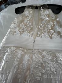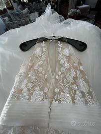 Abito Nicole Milano in tulle con applicazioni in pizzo francese e paillettes. Schiena effetto nude con ricami, leggero strascico, 7 strati di sottogonne. Condizioni perfette ( no strappi, no scuciture ). Lavato professionalmente.