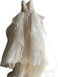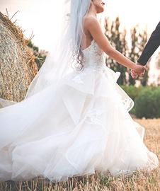 Vendo spendido Abito da sposa, Nicole Milano, acquistato nel 2019, pagato 2.500€ ( velo incluso nel prezzo). Modello elegante e romantico con : - corpino a cuore con pizzo ricamato - ampia gonna in tulle e organza, con applicazioni floreali. - velo coordinato. L'abito è stato indossato una sola volta, lavato e riposto subito. Pronto all'uso. Perfetto per chi sogna un abito da favola. Taglia : 38/40 IT Altezza con tacchi : Io sono 1.58, indossavo tacchi 12 cm. Per maggiori info, potete scrivermi un whatsapp. PREZZO : 1,500€