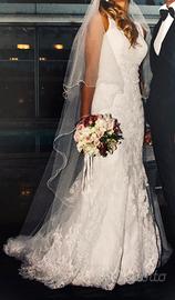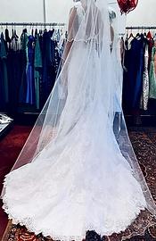 Elegante abito bianco a sirena, aderente e raffinato, con spalline in pizzo trasparente impreziosite da Swarovski. La schiena è scoperta e finemente ricamata con dettagli in Swarovski, per un effetto luminoso e sofisticato. Lo strascico è dotato di anello per il dito, per facilitarne il movimento durante la cerimonia.