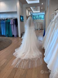 - Velo lungo con taglio vivo e calata (se la si vuole utilizzare). Il velo è più lungo della coda dell'abito ed è bianco ottico