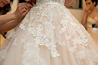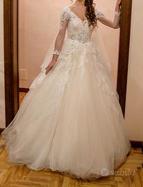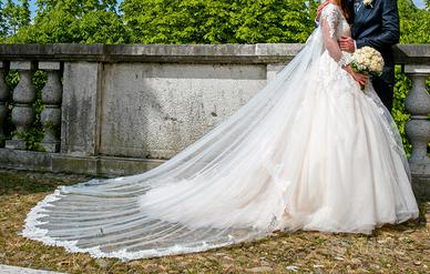 Splendido abito principesco di Nicole Spose realizzato con pizzo macramè e tulle. Velo lungo realizzato anch'esso con tulle e pizzo macramè.