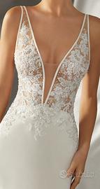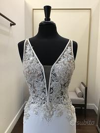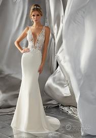Dalla collezione Voyage di Mori Lee. Questo abito è leggero e morbido. Presenta una gonna in chiffon soffice e un corpetto ricamato con base nude con perline di cristallo tendente allo champagne e una profonda e sexy scollatura a V. La schiena è scoperta con dettagli di bottoni rivestiti. Modello ad A colore avorio . Coda lunga 1,20cm L'abito è NUOVO. TAGLIA 42 ITALIANA Non è mai stato modificato né indossato, se non come campione da esposizione. L'abito ha ancora tutte le etichette originali attaccate. PER TUTTE LE INFO SCRIVETEMI #abitodasposa