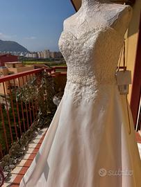 Abito da sposa marca Pronovias misura 46/48 senza alcuna modifica,colore bianco seta con sottogonna, corpetto scollo a cuore ricamato e impreziosito da perline e cristalli, comodo strascico.Nuovo(vedi foto)con ancora etichetta mai usato.Pagato 1200 euro Svendo per 650 non trattabili cedo inclusi il sacco per trasportarlo, coprispalle in regalo incluso che misura (S/M)