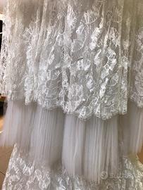 Abito da sposa nuovo vintage anni 80. Creato da atelier Mario Borsato Treviso/Milano. Abito a balze con pizzo in seta. Taglia 40