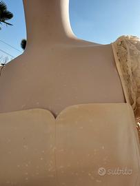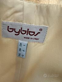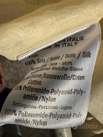Abito corto alle ginocchia , da sposa o da cerimonia, color écru avorio , seta e pizzo , 2 sottogonne sotto quella di pizzo , maniche pizzo lunge con bottoni a chiusura , scolo a cuore , retro scollo a V , seta e pizzo , tagoia small , 42 , Byblos