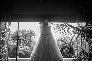 Abito da sposa taglia 42. scollo a cuore e parte superiore plissettata gonna liscia e voluminosa con strascico. cinturino con punti luce.