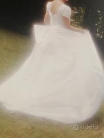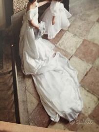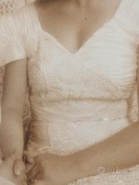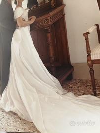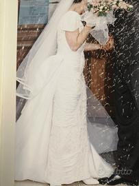 Vendo abito da sposa come da foto. Tg. 42-44. Modello tubino lungo drappeggiato, ricamato a mano con perline. Sopragonna con strascico lungo in tessuto seta pura e con sottogonna in tulle. Naturalmente usato solo il giorno dell'evento. Prezzo trattabile.