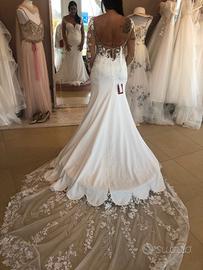abito da sposa di " Anna spose Group" 2024 bianco, scivolato, maniche lunghe in pizzo francese scollo a cuore strascico di 2 metri in pizzo, acquistato a 5000 euro vendo a 2300 euro trattabili. Alessandra