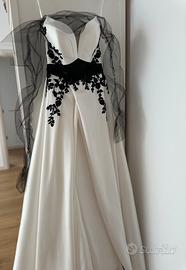 Abito da sposa Modeca collezione Eterna di Le Papillon, colore avorio e nero, scollo a cuore, in pizzo, micado e paillettes, dotato di tasche. Un meraviglioso abito indossato un giorno, già lavato da ditta specializzata, disponibile per la prova. Taglia riportata 36, posso fornire le misure in dettaglio (io sono alta 172 cm per 60 kg).