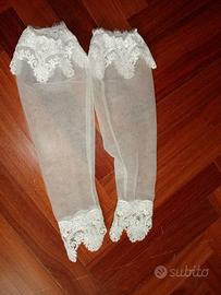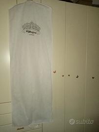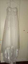 Vendo abito da sposa usato una volta sola comprato da 8 mesi fa. Abito in tulle scintillante e pizzo rasato corto davanti e lungo dietro con corpetto a cuore di pizzo scintillante e rasato con stecche che scendono lungo il corpetto con velo doppio vola' davanti che copre il viso completo di pettine sempre di tulle scintillante e pizzo rasato, più manicotte uguale all'abito con elastico nelle braccia e pizzo che scende alle mani.