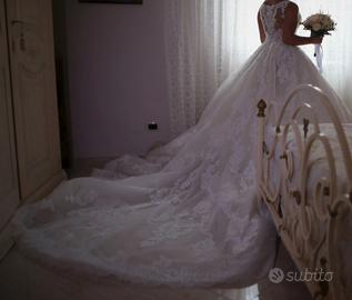 Splendido abito da sposa ampio marca Demetrios Platinum usato solo per mezza giornata etichetta e cartellino visibile compreso di velo,ricamato con pizzo e organza,corpetto semitrasparente e pagliette come si vede in foto,coda lunga 3 metri schiena effetto tattoo ricamato.