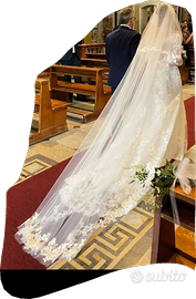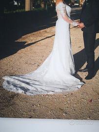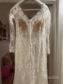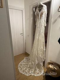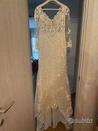 Come da titolo vendo abito da sposa, taglia 46 e modello a sirena. L abito presenta trasparenze, pizzo floreale e perline. L abito ha un elegante scollo sulla schiena con bottoncini. È in perfetto stato ,