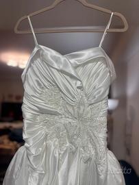 Abito da sposa principesco, corpetto aderente, drappeggio incrociato, dettagli di perle