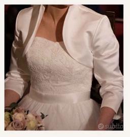 L’abito è completo di gonna tulle, velo e copri spalle.
