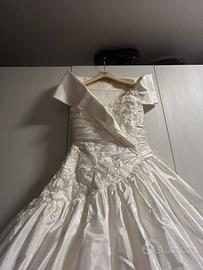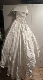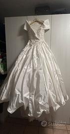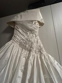 Venfo sbito da sposa color bianco in tafta in seta e cirpino in pizzo con collo importante e coda. Taglia 44