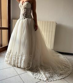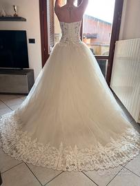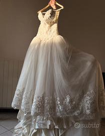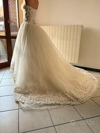 Abito da sposa stile principessa, con corpetto molto luminoso a perline e scollo a cuore, ampia gonna di tulle con cerchio sotto e ricamo alla base. L'abito è stato indossato solo un paio di ore per la cerimonia e subito portato in lavanderia per essere lavato, stirato e rimesso a nuovo. Grazie al suo meraviglioso corpetto dotato di laccio è possibile regolarlo su più taglie, allargandolo o stringendolo in base alle esigenze. (Quando mi sono sposata ero una taglia M mentre ora sono una taglia XS e si adattava perfettamente allora come adesso!) Acquistato solo due anni fa in atelier, lo rivendo ad un terzo di quanto l'ho pagato. È un peccato che rimanga chiuso dentro ad un sacco, vorrei tanto che qualche sposa potesse indossarlo di nuovo.