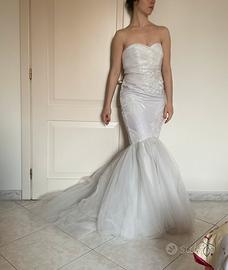 Vestito da sposa vintage senza le spalle con scollatura a cuore, taglio a sirena con coda lunga di tulle, ha il corpo interamente ricoperto da paillettes bianche. È perfetto per il grande giorno o per una cerimonia, elegante e con reggiseno incorporato.