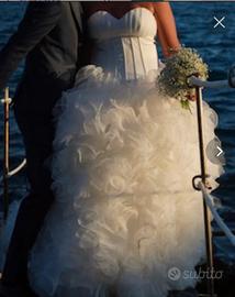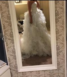 Vendo abito da sposa stile principesco con gonna molto ampia in tutte a balze. Lungo strascico. Bustino con stecche chiusura intrecciata con nastro. Bustino in raso con coppe per il seno. Taglia 46/48. Realizzato su misura. Modificabile. Prezzo trattabile.