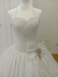 Splendido abito da sposa stile principessa, realizzato in tulle leggero e luminoso con corpetto interamente ricamato a mano con perline e paillettes.