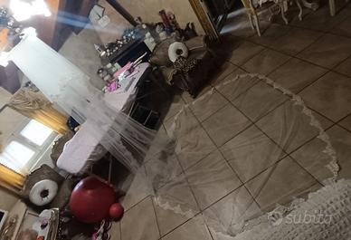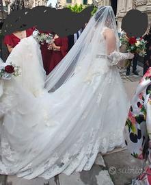 Abito color panna,color seta,non ha usure,da lavare...è in tulle è pizzo rebrodè lavorato con perline varie...abito compreso di velo,guanti,sottogonna,corona,orecchini e collana...disponibile per altre foto e informazioni...per chi volesse sono disponibili le scarpe con lo stesso pizzo dell'abito misura 39...prezzo non trattabile