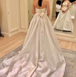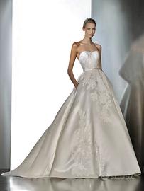 Abito da sposa Pronovias "Primura", originale acquistato presso l'Atelier di Roma. Realizzato in lussuoso mikado di seta avorio impreziosito da applicazioni in pizzo Chantilly. Alcune applicazioni hanno piccole perle e paillettes. Senza spalline con scollatura a cuore, silhouette a palloncino con strascico a cattedrale e sottile cintura in mikado di seta intorno alla vita. Bottoni rivestiti impreziosiscono il corpetto posteriore dove é aggiunto un fiocco di seta. Perfetto per qualsiasi tipo di cerimonia in stile principesco. Colore: Avorio/champagne --> Regalo sottogonna in tulle per una gonna ampia. Alla vendita si puó aggiungere velo lungo a cattedrale con bordini in raso dello stesso colore dell'abito. Tasche laterali nascoste. Sacca riponi abito compresa. Portato in tintoria dopo l'uso. Consegna preferibilmente a mano. -> PREZZO TRATTABILE (prezzo finale in atelier €3400)