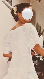Abito interamente realizzato a mano, tessuto organza bianca. Scollo quadrato, maniche corte a palloncino con fiocco intrecciato. Motivo fiocco ripreso sul dietro, al termine di una lunga fila di bottoncini veri (tutti da allacciare), ricoperti in organza e rotondi.