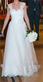 Abito da sposa Rosa Clarà realizzato in pizzo, organza e tulle. Sotto il tulle ed il pizzo la gonna è plissettata. L'abito è morbido e leggero da indossare. Taglia 42. Regalo velo e cuscino fedi.