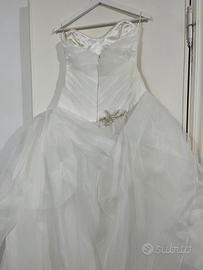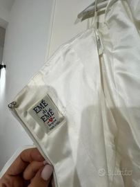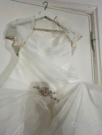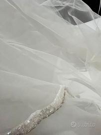 Splendido abito da sposa EME in seta e tulle con piccoli dettagli in perle e swarovsk. Velo che riprende gli stessi dettagli e copri spalle. (Il vestito ha un piccolissimo buchino e perciò il prezzo è tale.)